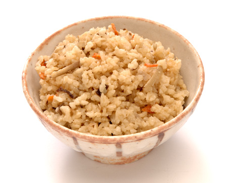 うるち米、乾燥具材〈醤油粉末、ドロマイト(炭酸カルシウムマグネシウムの含有物)、乳糖、人参、砂糖、食塩、ごぼう、椎茸、乾燥鶏肉、チキン粉末、粉末油脂、水耳、酵母エキス粉末、魚介粉末、ギャバ、調味料(アミノ酸等)、カラメル色素、グリセリン、(原材料の一部に小麦、大豆、乳、鶏肉、豚肉を含む)〉