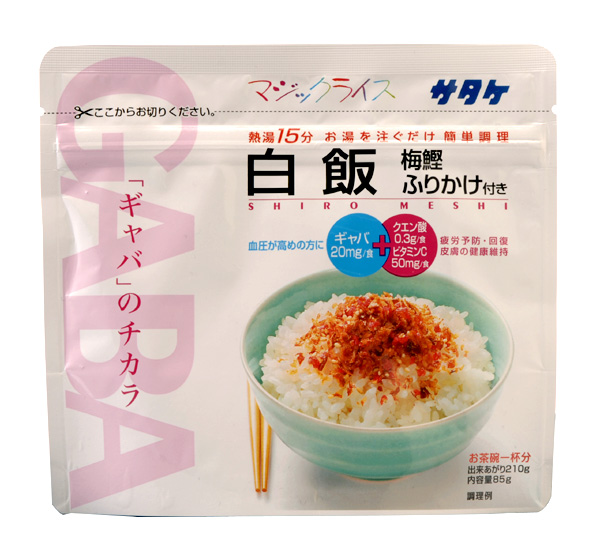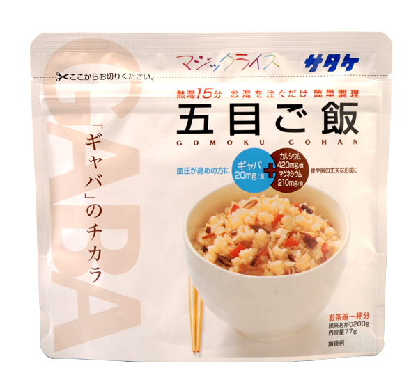 非常食は、空腹を癒せればいいというものではありません。非常時だからこそ、おいしいものが食べたい。栄養のあるものが食べたい。そして、慣れ親しんだ食事、ご飯が食べたい。マジックライスは、阪神淡路大震災や新潟中越大震災など、近年の震災時にも被災地に持ち込まれ、多くの方々に喜ばれました。米を一度炊き上げ、乾燥させたアルファ化米だから、お湯を注ぐだけで、手軽に暖かいご飯がいただけます。ギャバやビタミンC、クエン酸も配合。栄養もバッチリです。