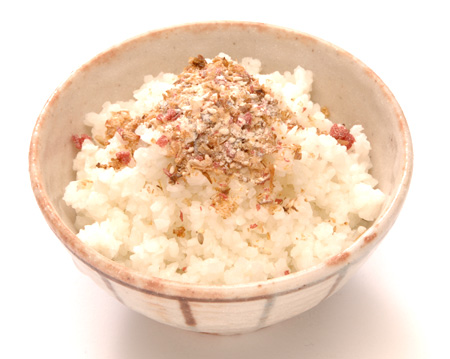 うるち米、ふりかけ〈乾燥梅肉、鰹、食塩、乳糖、砂糖、醤油、ごま、ギャバ、調味料(アミノ酸等)酸味料、ビタミンC、ムラサキコーン色素(原材料の一部に乳、小麦、大豆を含む)〉